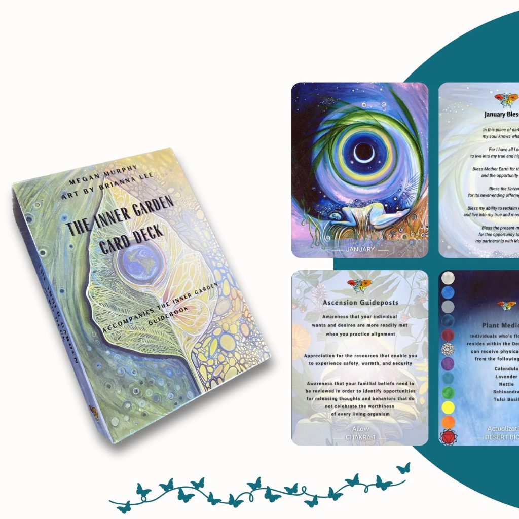 The Inner Garden Card Deck is intended to accompany The Inner Garden book and can also be used on its own for divination. It is a 72 card deck composed of 6 distinct sets of 12 cards. Art by Brianna Lee. Available for purchase from https://backyardbeauty.net